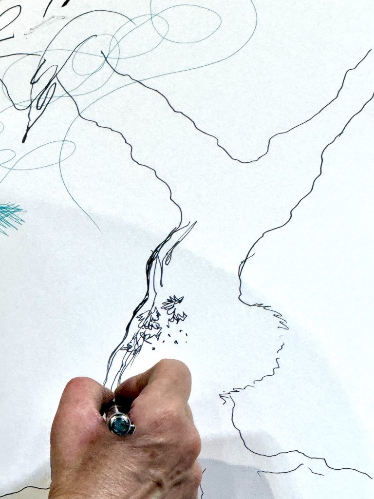 Caroline started her discussion talking about different types of pens and how to approach line drawing with them. In discussing the pens we are referring to the different types of ink formulations that they use. Caroline talked more on fountain pens and dip pens but there are others such as ballpoint pens, gel pens, roller ball,felt pens, et cetera. Each of these can affect your technique. An example is that gel pens provide smooth vibrant lines, ballpoint pens offer more control and durability and dip pens can give a variety of widths of lines.