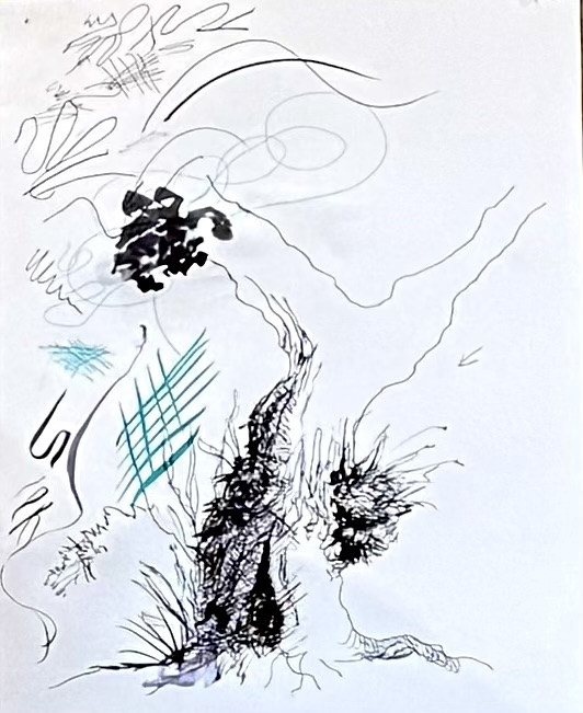 Caroline started her picture with a light pencil drawing of an old tree. This was followed with an outline using her fountain pen. The shadows using crosshatchings at different angles were used. She layered this to get depth and darkness. She stated the focal area should be the darkest against the light. She changed to a dip pen to get fine lines and different textures. At this point she mentioned that dip pens also come in glass in case you have a very rough surface to paint on. The nib which is built-in has a spiral to keep lots of ink as you proceed.