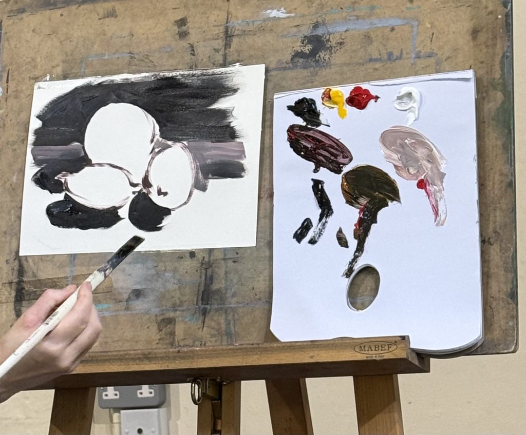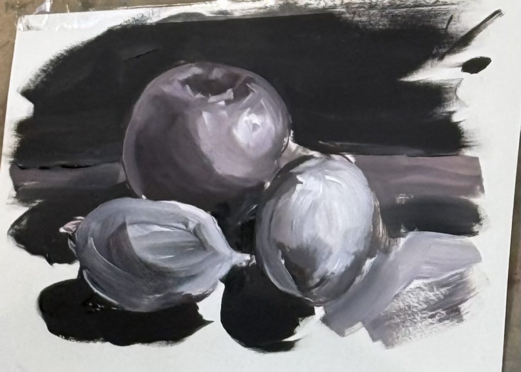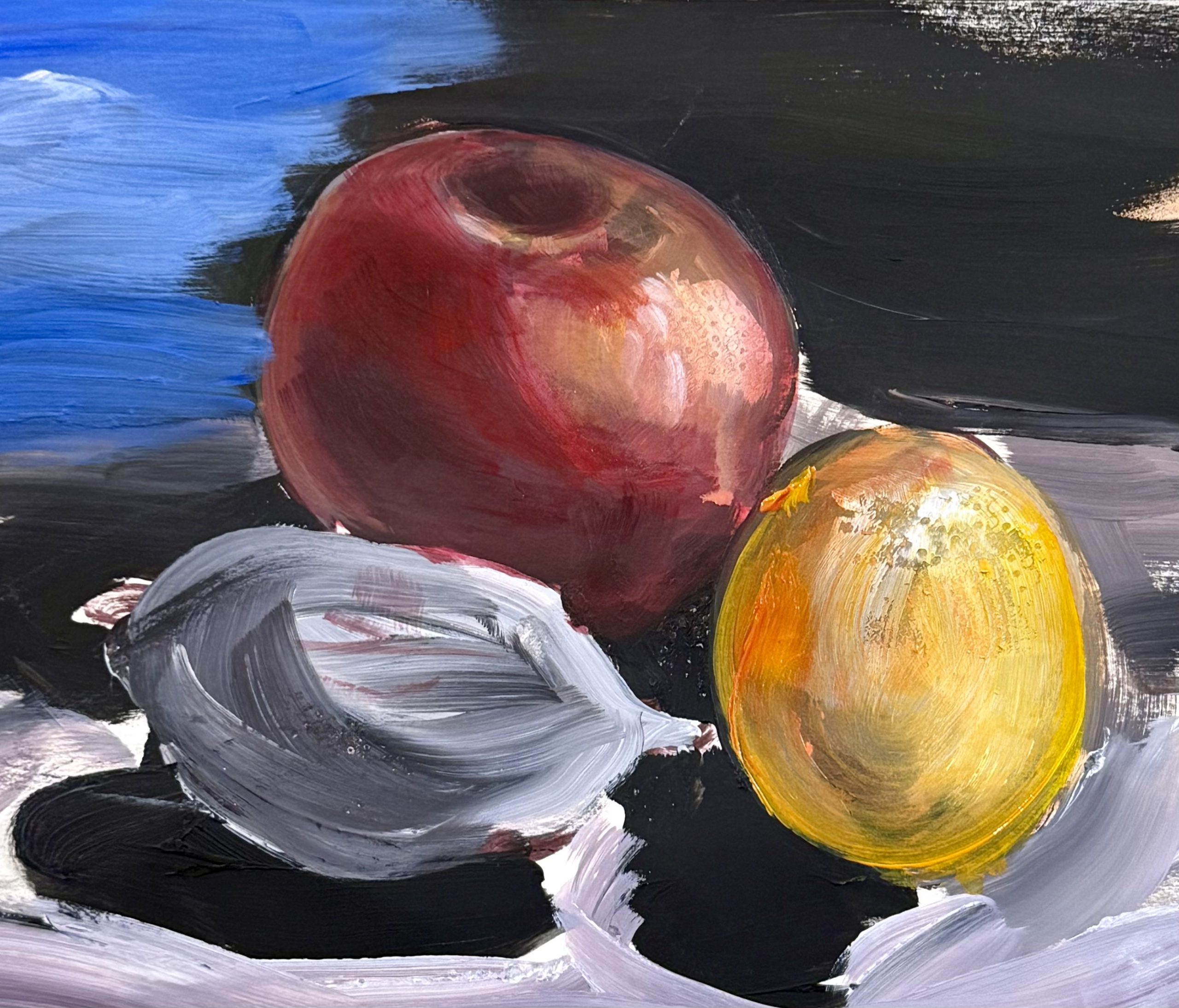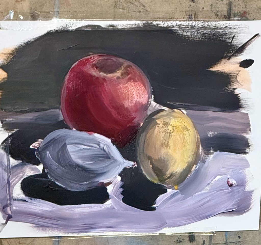 She started with the drawing of three fruits with a dark background, using yellow, red, black and white paints effecting a disappearing edge and reflected light. She used a watered down red color letting it dry in between layers. It gave an optical effect tinting a subtle change in the black colour. Watered down yellow was added. She warned that white paint added would give a chalky effect but can be used to lighten. Adding the layers of glaze gives the picture luminosity. The more layers you put on the smoother it becomes showing no brush marks and giving a lovely depth of field.